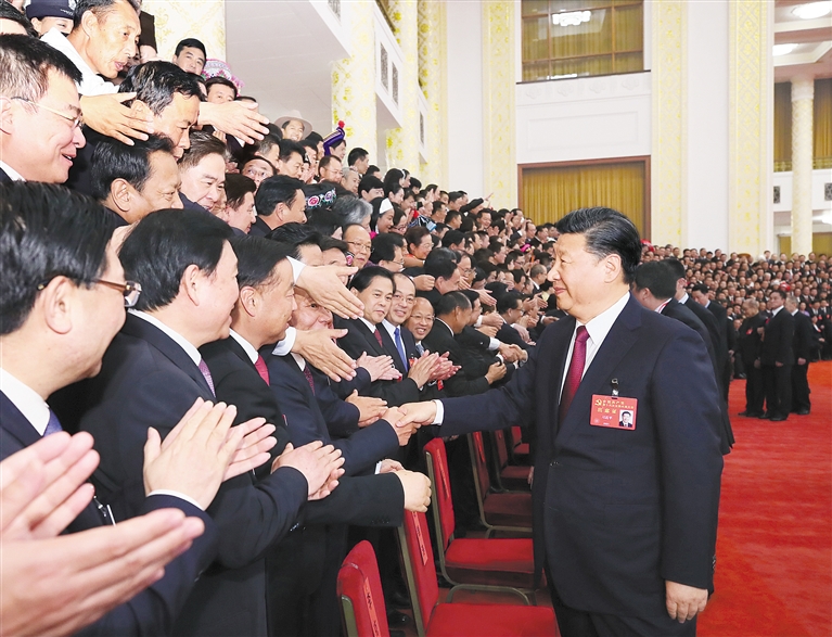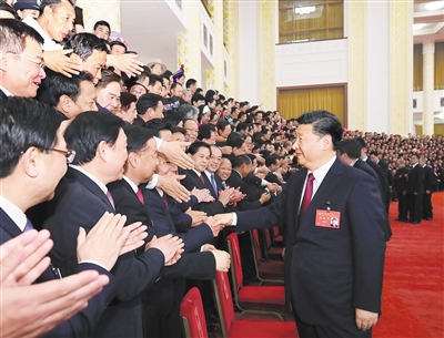 下午4时,习近平等步入宴会厅,全场响起长时间热烈的掌声。习近平等领导同志向大家挥手致意,走到代表们面前,同前几排同志亲切握手,不时互动交流,向他们问好。代表们纷纷向习近平等领导同志致意,送上热情的问候。大厅内,真情涌动,暖意融融,掌声、欢呼声经久不息。