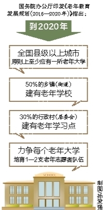 近年来,老年教育事业越来越得到党和政府的重视。去年10月,国务院办公厅印发《老年教育发展规划(2016—2020年)》指出,老年教育的增量重点放在基层和农村,形成以基层需求为导向的老年教育供给结构,优化城乡老年教育布局,因地制宜地开展老年教育。探索以开放大学和广播电视大学为主体建设老年开放大学,开发整合远程老年教育多媒体课程资源。到2020年,各省(区、市)都应初步建立起支撑区域内老年教育发展的老年学习资源库。