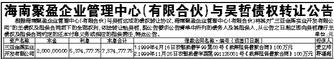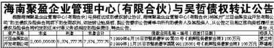 海南聚盈企业管理中心(有限合伙)与吴哲债权转让公告