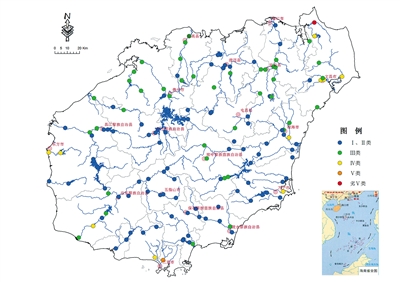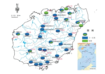 全省地表水环境质量总体为优,水质总体优良率为91.6%。开展监测的52条河流110个断面中,91.8%的监测断面水质符合或优于地表水Ⅲ类标准。其中,Ⅱ类水质断面占60.9%,Ⅲ类占30.9%,Ⅳ类占6.4%,Ⅴ类占0.9%,劣Ⅴ类占0.9%。Ⅳ类水质分布在塔洋河、文教河、文昌河、东山河、三亚河、罗带河的局部河段,Ⅴ类水质分布在三亚河的城市河段,劣Ⅴ类水质分布在珠溪河的入海河口。