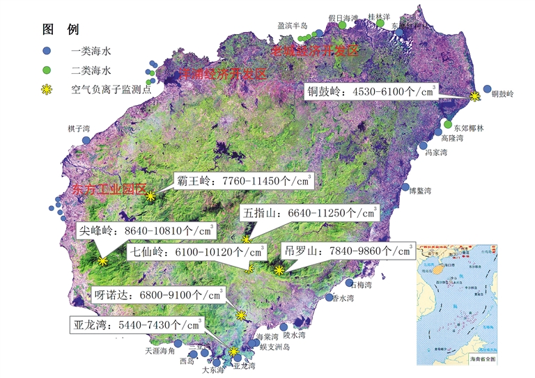 全省主要森林旅游区空气质量优良。霸王岭、尖峰岭、五指山、七仙岭、铜鼓岭、亚龙湾、吊罗山、呀诺达8个主要森林旅游区空气负离子平均浓度分别为9480个/cm3、8885个/cm3、8430个/cm3、8020个/cm3、5330个/cm3、6480个/cm3、8750个/cm3、8000个/cm3,远超世界卫生组织规定的清新空气1000cm3-1500个/cm3标准,对人体健康极有利。与去年同期比较,霸王岭国家森林公园、尖峰岭国家森林公园和呀诺达雨林文化旅游区的空气负离子浓度有不同程度的升高,其余森林旅游区空气负离子浓度无明显变化。