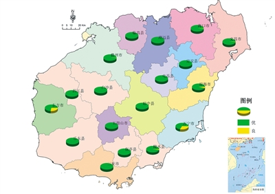 全省空气质量总体优良,优良天数比例为100%,其中优占96.2%、良占3.8%,无轻度污染、中度污染和重度污染天数。三亚、五指山、定安、屯昌、澄迈、临高、白沙、昌江、乐东、保亭、琼中11个市县空气质量优级天数比例为100%;其余7个市县(三沙市除外)优级天数比例在68.5%~98.9%之间。与去年同期比较,全省空气质量优良天数比例持平,其中优级天数比例上升4.1%。