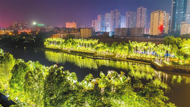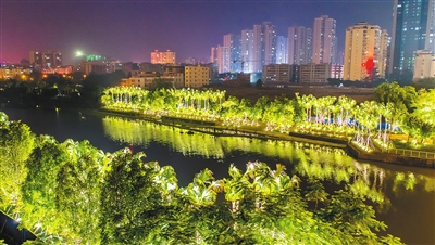 沿美舍河继续往下游走,在国兴大道与美舍河的交界处,这里河道开阔,整治过后的两岸种上了整齐的椰子树,夜晚在灯光的照耀下熠熠生辉。当地的老人介绍,就在这河道的中央,曾经有一座古塔明昌塔。