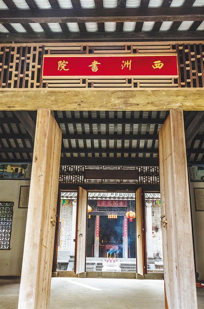 今天的西洲书院为后人重建,是一座三进三间的古典式建筑,灰色砖墙体,南北近百米长。第一进,石刻门匾为“唐氏大宗”四个楷体大字,两根石柱上,描金刻着一副“乡贤崇祀光南国,户部流芳拱北辰”的对联。第二进为“西洲书院”,当年是作为学校性质存在,培养了许多家族内外的学子。第三进便是唐氏祠堂。门及门柱上,红底描金刻着“家规垂训翼孙谋,身范克端绳祖武”“万里春风陶礼乐,百年老业绍箕裘”的祖训。