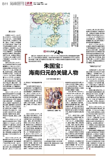 据《元史·朱国宝传》记载,至元十六年(1279年),朱国宝担任海北海南道宣慰司宣慰使,不久又专任海南四州宣慰使。他采取恩威并施的方针,使海南很快从宋元之战的动荡中恢复了宁静,成为海南归元的关键人物。朱国宝对海南的发展有积极的意义,因此被当地百姓祀为名宦。