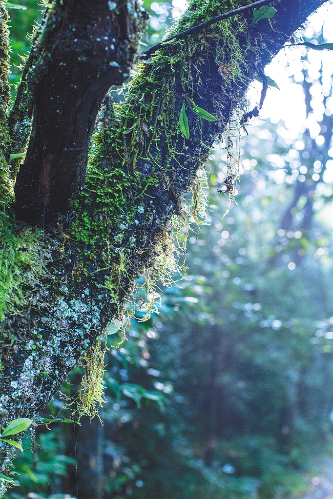 湖景观赏结束后,朋友们分两路走,一路去了望塔,从高处环顾森林全景,寻找乌蒙山水夏末秋初的痕迹;一路沿着溪岸小径,去看三叠瀑布。我选择后者,想看看高原平湖之水飞起来的姿态。当地的朋友说,值得一看的还有三叠瀑布日夜奔赴的那面仙女湖。于是,我们三三两两地往山林深处行进,在空气湿润清凉、光线明暗不定的亚热带林区小径上,边走边看,看杂树繁茂、藤条纠缠、山花缤纷,看苔藓密布、野菌丛生、蜂蝶飞舞,看曲水载着落木,时而缓时而急地经过灌木丛和高枝投下的荫影……我们的目的地很清楚,却在途中散散漫漫地花了一个多小时。而我,也在山行过程中渐渐消减了看瀑布的兴致。此刻想起来,印象深刻的,竟不是三叠瀑布和仙女湖,而是去路上随处可见的缠满开叉树干的寄生物,垂挂在夕照逆光中,湿漉漉的幽蓝、墨绿、浅绿,以及鹅黄,颜色好看得让我更乐意用耳朵去倾听,而不是用眼睛去观看。还有,寄生物上的晶莹水滴,闪亮着一圈圈轮廓光,多看一眼,真难保自己不会因走神而跟不上朋友们的脚步。