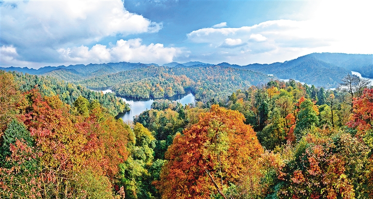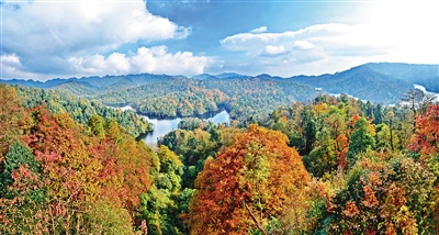 那天,车子一直把我们送到铜锣坝顶上。朋友们在林木茂盛、水光潋滟的湖山之间下车,争相抒发感情,都说这里好美,脱光了跳下去游泳该有多爽!事实上,没有人下水游泳。我们在船上移步观景,说说笑笑。游船缓缓行驶,清波一圈圈地向岸边荡漾开去。高高低低、层层叠叠的树木,在距离湖岸很近的水里,在湖岸上面,挺直了身子站立着,倒影齐刷刷地映进水镜中,清秀得动人心弦。在近处、远处、更远处,湖湾牵牵连连,山头错错落落,层岚飘飘渺渺,随便拍摄其中的一段,都能得到一帧清幽的画面。要是在气温渐低的早晨,湖面上,山峦间,雾岚将更加弥漫,湖光山色也必定更加迷人了。当秋风给这里的山山水水换上新装,当天空蓝得更加纯净,五彩斑斓的叶片将在树梢随风飘摇,也将纷纷落向湖面上和小径中,那样,景区一年中迷死人不偿命的时光就到来了。