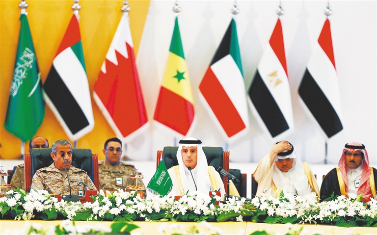 10月29日,在沙特阿拉伯首都利雅得,沙特外交大臣朱拜尔(中)出席一场多国外长和总参谋长联席会议。 沙特阿拉伯领导的多国联军29日在沙特首都利雅得举行多国外长和总参谋长联席会议,协调在也门的军事、外交和人道主义行动。 新华社/路透