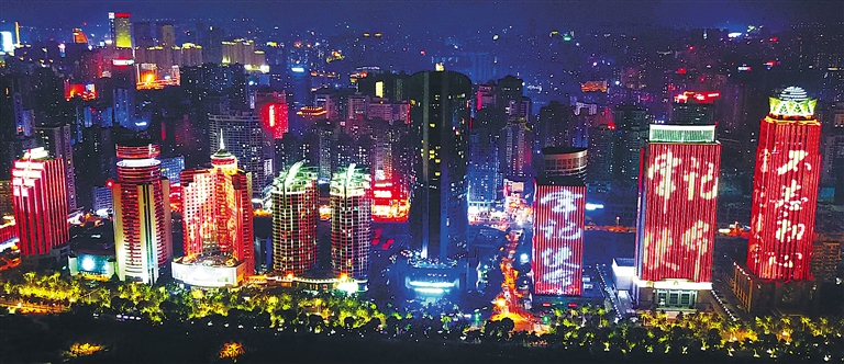 海口扎实推进党的十九大精神进企业、进农村、进机关、进校园、进社区、进军营、进网站活动,充分利用各种传播手段,为学习宣传贯彻党的十九大精神营造良好氛围。图为10月30日晚,海口市滨海大道高层建筑灯光景观。(海口市委宣传部供图)