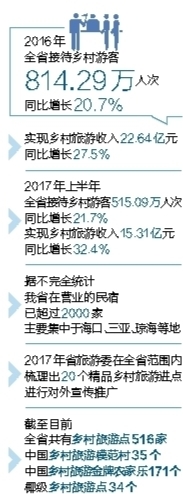 近年来,我省以全面深入实施“美丽海南百千工程”为重要抓手,加快发展乡村旅游发展,加快打造特色乡村旅游产品,重点培育出了琼海田园城市、琼中奔格内、保亭布隆赛等一批特色鲜明、初显规模、影响较广的乡村旅游产品。数据印证了乡村旅游强劲的发展势头:2017年上半年,全省接待乡村游客515.09万人次,同比增长21.7%,实现乡村旅游收入15.31亿元,同比增长32.4%。