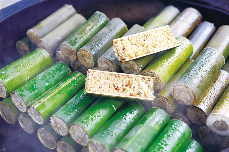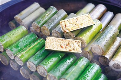 昌江的黎家竹筒饭用新鲜竹筒装着大米调味烤熟,竹节青翠,米饭酱黄,柔韧透口,吃时饮一口黎家“山兰酒”,满口都是黎家风味。
