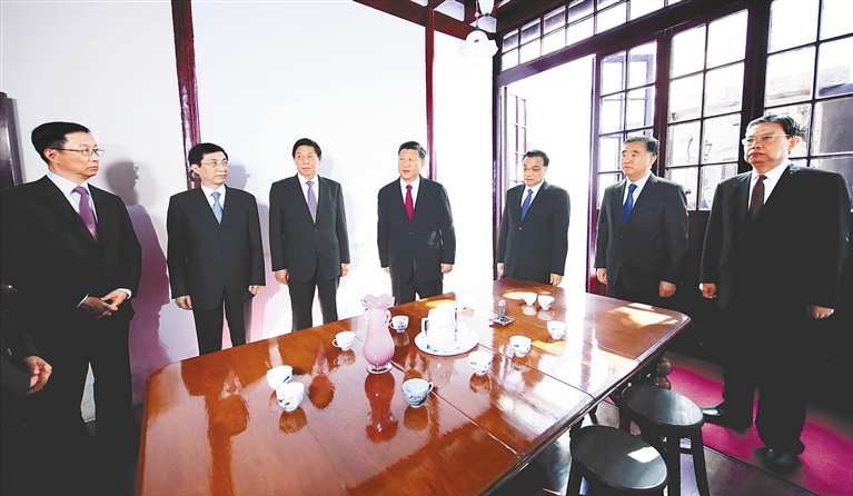 参观结束时,习近平发表了重要讲话。他表示,我们全体中央政治局常委同志这次集体出行,目的是回顾我们党的光辉历程特别是建党时的历史,进行革命传统教育,学习革命先辈的崇高精神,明确肩负的重大责任,增强为实现党的十九大提出的目标任务而奋斗的责任感和使命感。