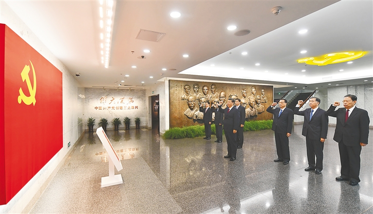 纪念馆宣誓厅,悬挂着巨幅中国共产党党旗。面对党旗,习近平带领其他中共中央政治局常委同志一起重温入党誓词。在习近平领誓下,铿锵有力的宣誓声响彻大厅,让现场所有人都深受感染,仿佛回到了那个风雨如磐的年代。习近平强调,入党誓词字数不多,记住并不难,难的是终身坚守。每个党员要牢记入党誓词,经常加以对照,坚定不移,终生不渝。