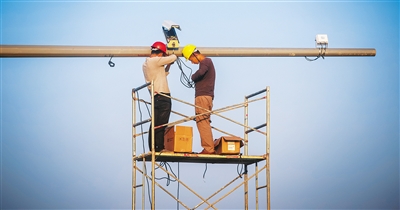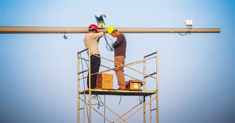 11月2日,在海口市椰海大道,工作人员正在调试安装高清摄像头。