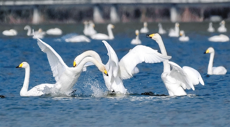 11月2日,几只大天鹅在山西平陆黄河湿地水面上嬉戏。 近日,千余只大天鹅陆续飞抵山西省平陆县黄河湿地,准备在这里栖息越冬,黄河湿地变成了美丽的“天鹅湖”。近年来,山西平陆黄河湿地生态环境不断改善,每年到此越冬的大天鹅数量在1万只左右。 新华社发(薛俊 摄)