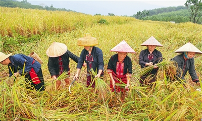 而最让游客期待的,是亲身感受收割山兰稻以及古法磨米等体验活动。在全省山兰稻种植面积最大的青松乡拥处村,成片的金黄稻穗在微风中摇曳,游客们拿起原始的镰刀,依照古老技艺收割山兰稻。不少游客都表示,没有什么能比亲手割下稻穗更能感受到丰收的喜悦。