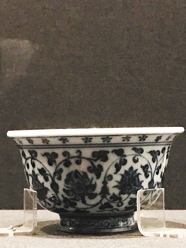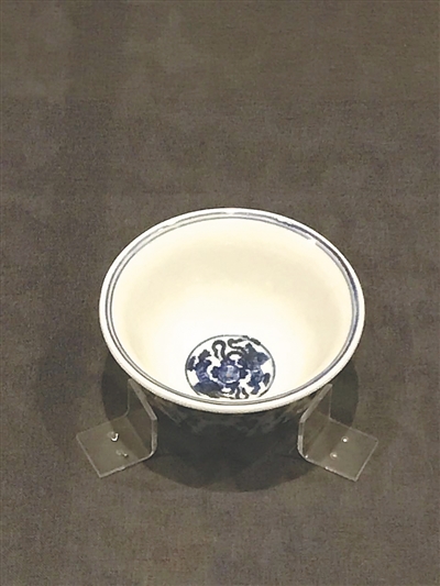 明人谷应泰在《博物要览》中这般高度评价“永乐青花压手杯”:“永乐年造压手杯,中心画双狮滚毬,为上品;鸳鸯心者,次之;花心者,又次。杯外青花深翠,式样精妙。”北京故宫博物院珍藏的,是杯的中心画双狮滚毬者和画花心者。