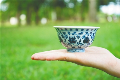 原来,“永乐青花压手杯”现在可知的只有两件完整作品,都在北京故宫博物院,另有两个残件,分别藏于故宫博物院和景德镇御窑厂遗址馆。为此,乐跃萍还先后6次飞往北京,反复观摩、强记,用手机拍照,回来再细细分辨上面的图案和颜色。