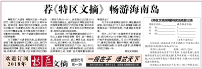 另外,为了进一步答谢所有的新老读者,我们将对2018年度《特区文摘》所有订户给予幸运抽奖奖励。凡2018年度我报订户,请将订报收据(复印件有效)寄至我报,我们将随机抽取50名幸运读者,免费赠阅《特区文摘》一年。