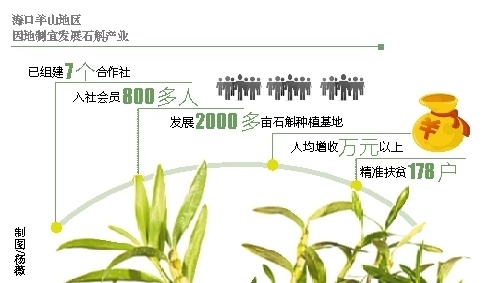 一个细雨濛濛的上午,海口市龙华区新坡镇斌腾村,海南石斛公司石斛驯化基地,村民朱红梅头戴草帽,手抓木屑,正往一株株石斛苗周围铺撒。这些被驯化的石斛苗会被移植到垒好的火山石上,或挂在树木上,生长、采摘、加工、销售,最后产生效益。