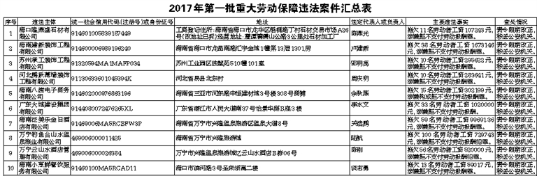 海南省人力资源和社会保障厅公告 关于公布2017年第一批重大劳动保障违法案件的公告