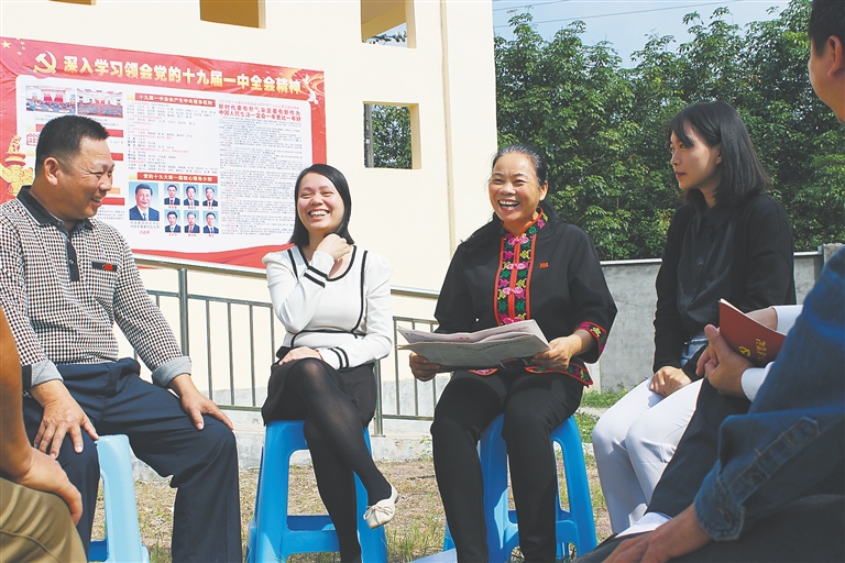 群山环抱,满目青翠。11月2日,位于深山中的儋州市兰洋镇番打小学,党的十九大代表、该校教师王金花正在宣讲十九大精神。当她谈及多项惠民政策时,现场迸发出热烈的掌声和欢笑声,洋溢着节日般的喜庆气氛。