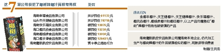 近期,全省工商部门共查获了7宗侵犯椰树牌椰汁商标专用权案件,总案值达763万余元,7家企业受到行政处罚。