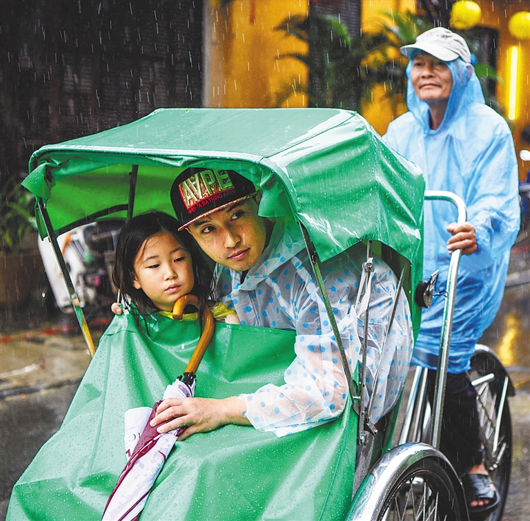 11月8日,在越南会安,游客乘车经过雨中街道。 越南中央预防自然灾害指导委员会8日发布消息称,台风“达维”在越南已造成89人死亡,另有18人失踪。 “达维”于4日凌晨登陆越南中部,截至目前除造成人员死亡和失踪外,另造成174人受伤,11万栋房屋不同程度受损,1200艘船只沉没,近万头家畜家禽死亡。