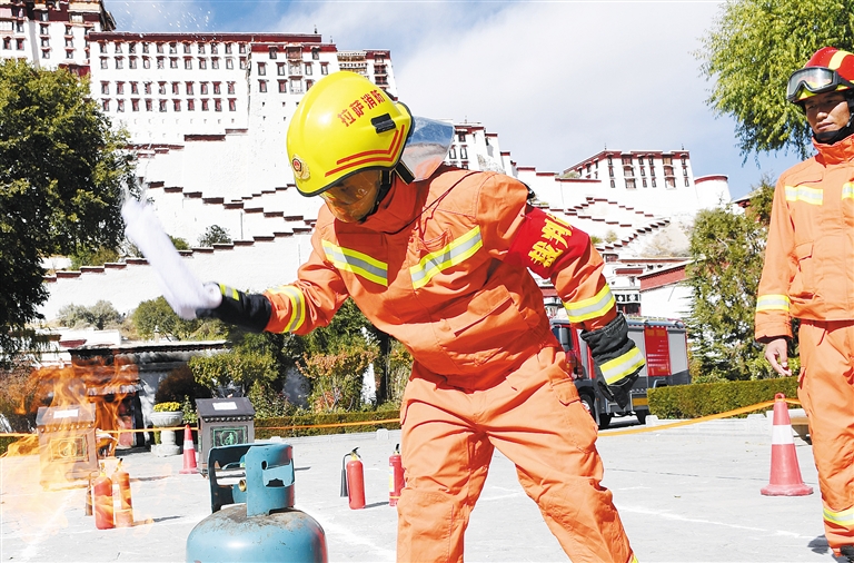 11月9日,消防战士演示灭火。当日,西藏拉萨布达拉宫管理处在布达拉宫消防大队的配合下,举办了一场消防宣传活动。 新华社发