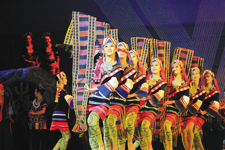 黎族织锦作为该剧中的核心贯穿始终,演出中,演员们手牵从舞台上方垂下的锦带来回穿梭,构起纵横交错的“写意”织锦,轻盈的身姿随锦带起舞,一个个绚丽的场景引来观众称赞。