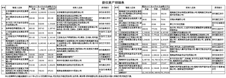 根据中国信达资产管理股份有限公司海南省分公司与海南富林企业管理合伙企业(有限合伙)签订的信琼-B-2017-006债权转让合同,中国信达资产管理股份有限公司海南省分公司已将依法享有的对下列借款人和担保人的债权(包括本金及利息)及担保权利依法转让给海南富林企业管理合伙企业(有限合伙),现以公告方式通知债务人和担保人。请借款人和相应担保人或借款人、担保人的承继人向海南富林企业管理合伙企业(有限合伙)履行还款义务(若借款人、担保人因各种原因发生更名、改制、歇业、吊销营业执照或者丧失民事主体资格等情形,请相关承债主体、清算主体代为履行义务或者承担清算责任)。 特此更新公告。 中国信达资产管理股份有限公司海南省分公司 海南富林企业管理合伙企业(有限合伙) 2017年11月10日