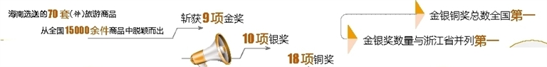 在2017中国特色旅游商品大赛中,海南选送的70套(件)旅游商品从全国15000余件商品中脱颖而出,斩获9项金奖、10项银奖、18项铜奖,以37个奖项的数量排名全国第一。