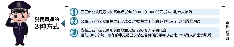 “我们将认真对待和研究每一条意见和建议,对您提供的意见、建议、线索采用核实后将给予重奖,并严格执行和落实问题台账和整改回访制度,让警民同心协力,推动三亚公安工作不断取得新进步。”三亚市公安局党委副书记、常务副局长、新闻发言人徐冰表示。三亚市公安局还出台了相关规章,通过制度层面保障上述三种沟通渠道畅通。
