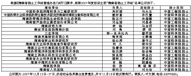 海南省科学技术厅关于2017年度“海南省院士工作站”设站的公示