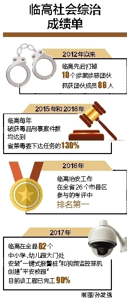 2012年以来,临高县委、县政府对违法犯罪活动保持高压严打态势,开展全民禁毒斗争,创新社会综合治理举措,让临高成为不法分子的高风险区、高代价区,成为人民群众的安全区、放心区。一个平安和谐、开放包容的临高,增强了人民群众的安全感和满意度,持续优化了临高发展的“软环境”。