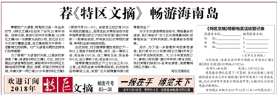 为了答谢广大读者的关爱,让更多的新读者了解、阅读到《特区文摘》,为此,我们开展这次读者荐报活动,请您将手中的《特区文摘》给您的同事、朋友、亲戚、邻里之间相互传阅,并请大家一同订阅2018年度《特区文摘》(邮发代号83—30)。在您自己已订阅2018 年我报的基础上,连同在此次荐报活动中您所推荐新增加的订户的订报收据(复印件有效)一起寄给我报,所有参加此次荐报的读者,将有机会参与抽奖奖励。