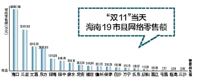 就地域情况而言,海口、三亚、文昌三市领跑海南“双11”当天网络零售额前三,分别实现8.90亿元、1.34亿元、0.42亿元,在全省分别占比62.70%、9.47%、2.99%,合计占比达75.16%,对海南“双11”当天网络零售额贡献突出。