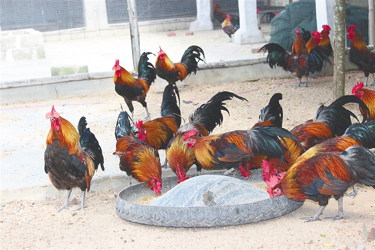 “咯咯哒——”11月12日,记者在青山耸翠、绿树掩映的儋州市大成镇红灯村看到,该村养殖大户唐后峰养的山鸡,戴着一副副红色的“眼镜”,一边鸣叫一边踱步前行。原本凶悍的山鸡,互相触碰后,居然互相“礼让”一下,各自伸长脖子啄食虫子、蚯蚓和谷物。前来订购的许多客商,也对戴“眼镜”山鸡感到新奇不已。