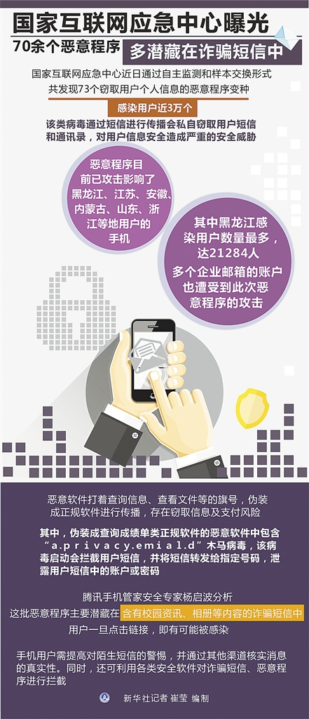 ●手机用户需提高对陌生短信的警惕,并通过其他渠道核实消息的真实性。同时,还可利用各类安全软件对诈骗短信、恶意程序进行拦截