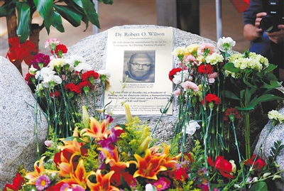 11月12日,在美国阿卡迪亚市,鲜花被放置在威尔逊医生纪念碑旁。 11月12日,在美国加利福尼亚州阿卡迪亚市,数百名来自中国和美国的民众出席了威尔逊医生纪念碑落成典礼。威尔逊医生被称为“蓝眼睛的南京人”。80年前,侵华日军制造了惨绝人寰的南京大屠杀,威尔逊医生挺身而出拯救了成百上千中国人的生命,同时见证和记录了日本侵略军在南京的残酷暴行。 新华社记者 李颖 摄