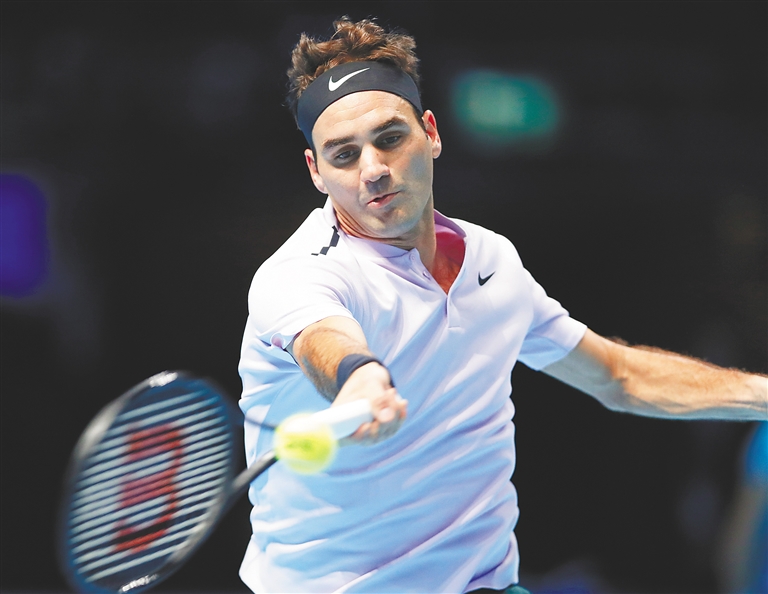 2017年ATP年终总决赛当地时间12日在伦敦东部的O2体育馆开赛。志在第七次夺冠的费德勒在小组赛首场比赛中,直落两盘击败美国选手索克,将他的连胜纪录扩大到11场。另外一场比赛,兹维列夫2∶1战胜西里奇。图为费德勒在比赛中。新华社发