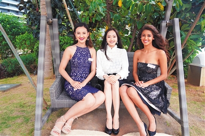11月13日,在三亚举行的第67届世界小姐总决赛期间,不少选手学习汉语普通话的热情很高,她们比赛之余会在欢声笑语中互相切磋普通话,偶尔还会用普通话表达对中国历史文化的喜爱。图为,新西兰选手(左)与蒙古国选手(中),在教法国选手(右)学习一些简单的普通话。本报记者 张杰 摄