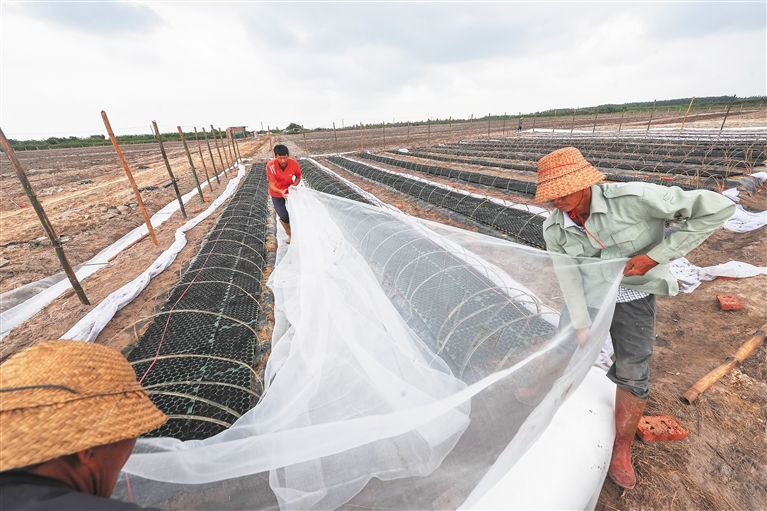 11月13日,文昌市冯坡镇凤尾村,村民在铺设可降解地膜,种植冬季瓜菜。