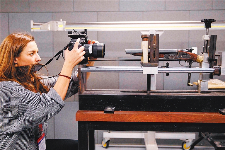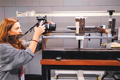 11月13日,在英国伦敦,一名记者在警察厅武器取证实验室拍摄一把加装了遥控装置的短管枪。 英国国家弹道情报局13日起开展为期两周的枪支收缴行动,呼吁国民上缴不需要的和非法持有的枪支。 新华社/法新