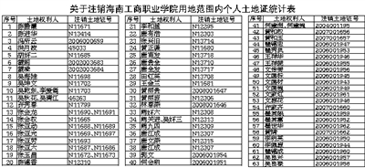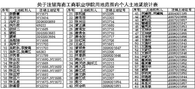 经我局以《关于完善海南工商职业学院、海口经济学院征地手续问题的请示》(海土资征字[2017]423号) (公文卡号:20171562924) 报市政府批准同意,由我局与海南工商职业学院签订70.443 亩《解决用地遗留协议书》,并已完善征地手续。现我局决定注销海南工商职业学院用地范围内的个人土地证,该学院用地范围内的个人土地证(详见附表)将不再具有法律效力。凡对此有异议者,请自本通告之日起15 日之内向我局琼山分局提出书面申诉。逾期视为无异议,我局将依法办理土地证注销手续。