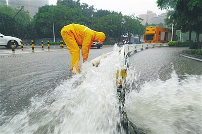 | 海口金牛路口附近出现大面积积水,市排水管道养护所的工作人员正在加紧排水。本报记者 王凯 摄 |