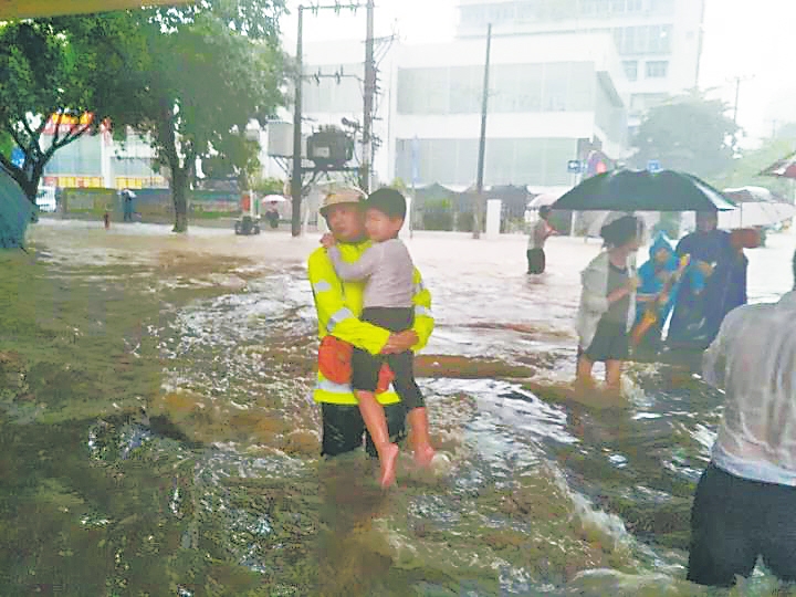 | 11月14日,海口南大桥下的积水较深,一名交警将放学路过的孩子抱过马路,送到安全的地方。图片来源/互联网 |