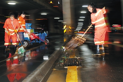 | 暴雨过后,海口市龙昆南路,环卫工人连夜清理垃圾,确保在最短时间内恢复路面洁净。本报记者 李英挺 摄 |