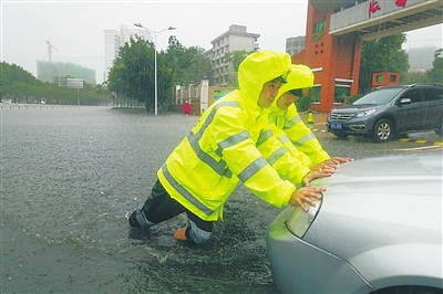| 在海口滨涯路农垦中学路段,两名协警冒雨帮助司机把车辆推放到安全地带。本报记者 王凯 摄 |