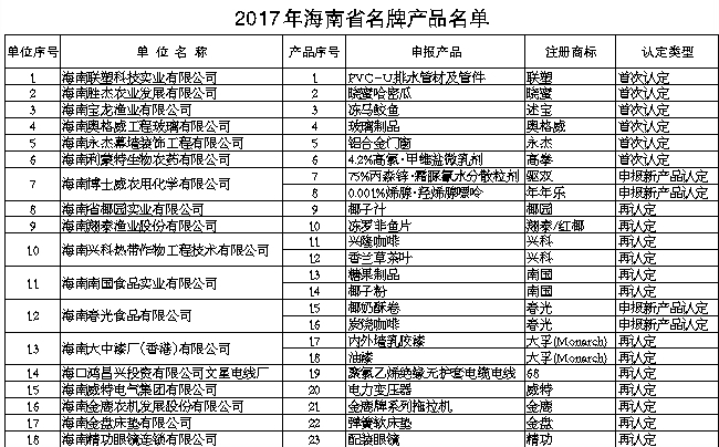 根据海南省人民政府第147号令《海南省名牌产品认定管理办法》的规定,经过企业申报、材料审核、初审认定、初审公示、顾客满意度测评、综合评价计分、海南省名牌产品认定委员会审查认定,海南联塑科技实业有限公司生产的PVC-U排水管材及管件等23个产品被认定为2017年海南省名牌产品。特此公告。
